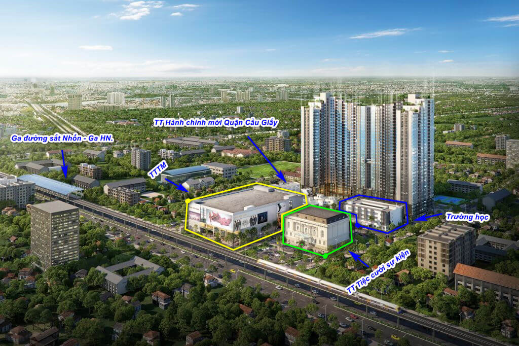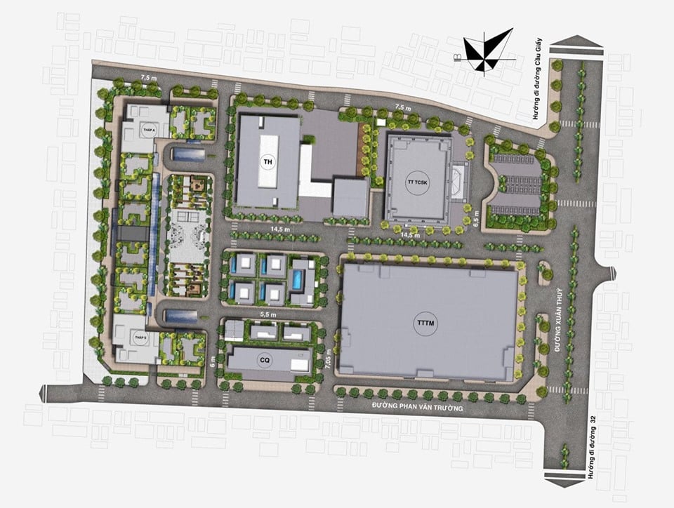 - Quy mô dự án gồm các công trình: Trung tâm thương mại; Trung tâm tiệc cưới, tổ chức sự kiện; Văn phòng Liên cơ quan Quận Cầu Giấy; Nhà ở (chung cư cao tầng và nhà thấp tầng); Trường học, bãi đỗ xe ngoài trời, cây xanh,…