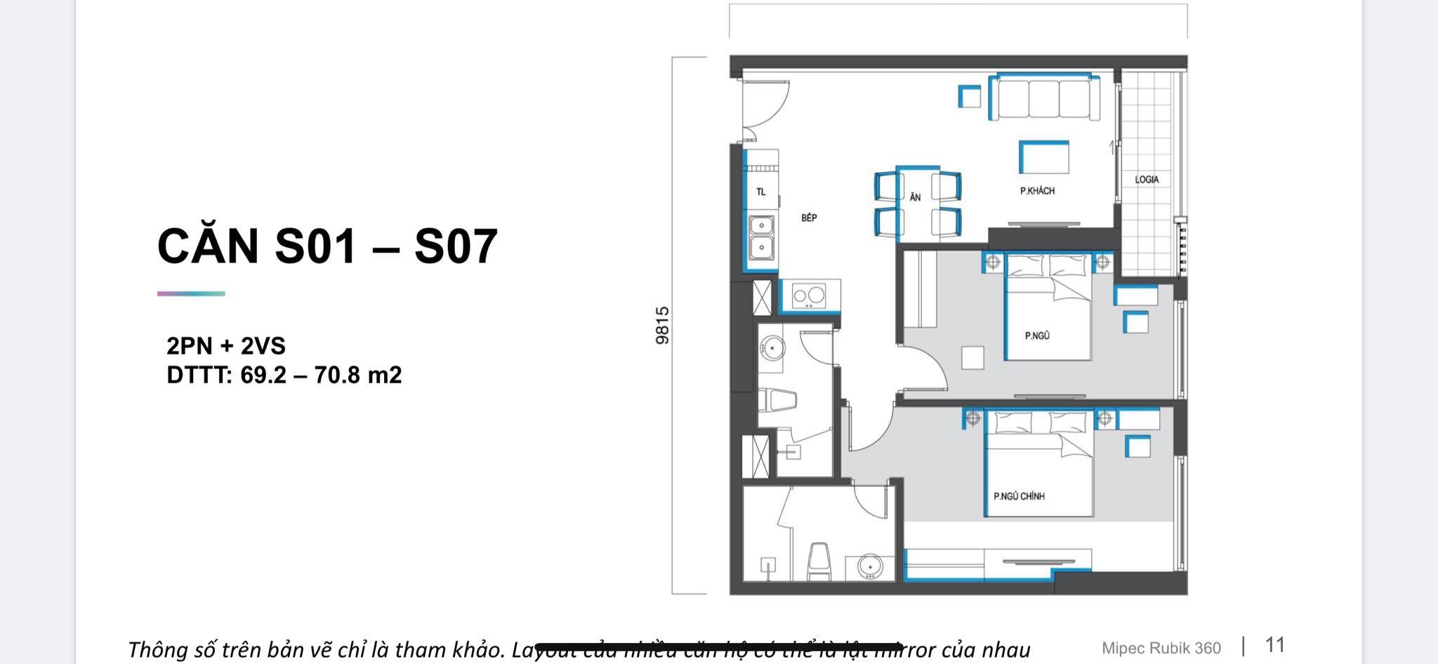 Mỗi tầng thiết kế 07 căn hộ loại này, đây là sản phẩm 02 phòng ngủ chủ lực của Dự án Mipec Rubik 360. Căn hộ này phù hợp với mọi khách hàng bởi rộng rãi.