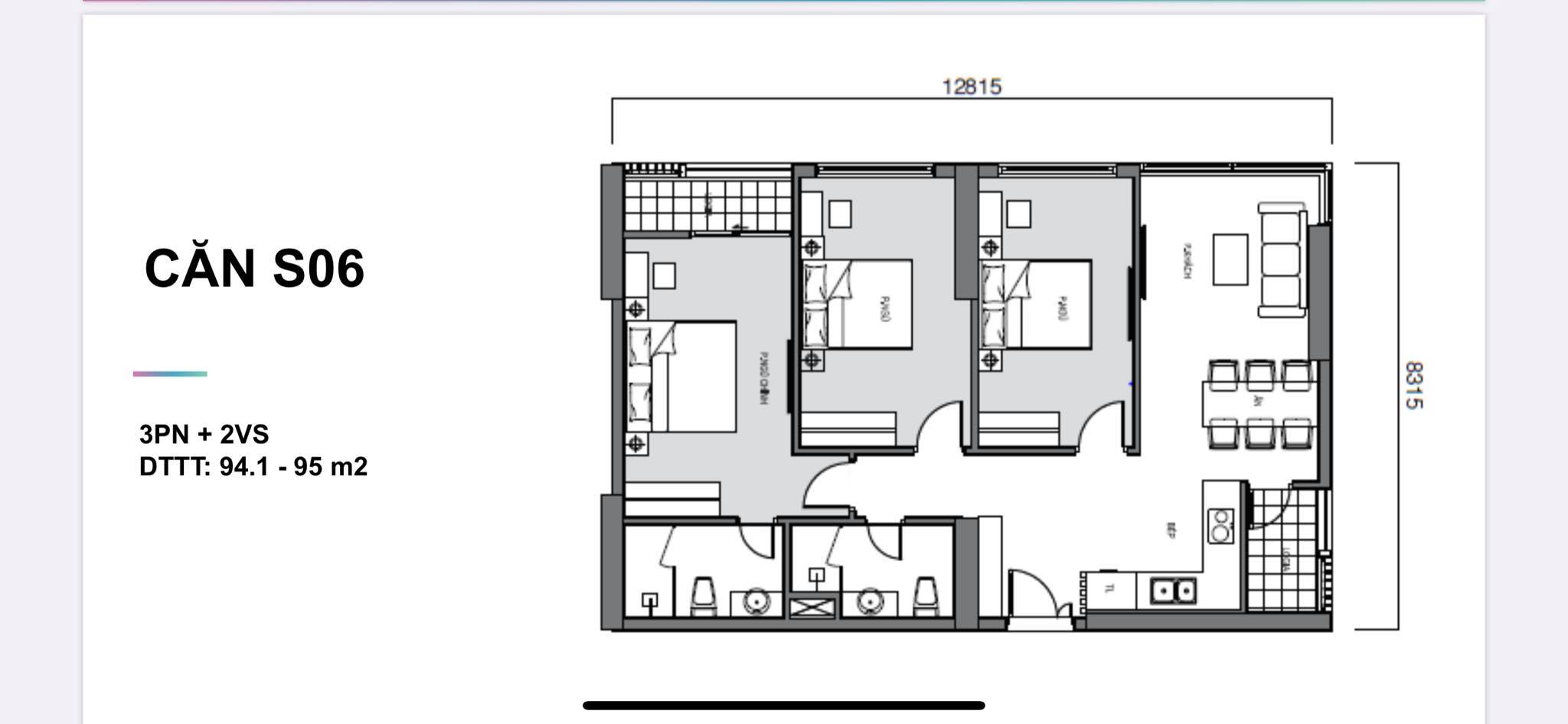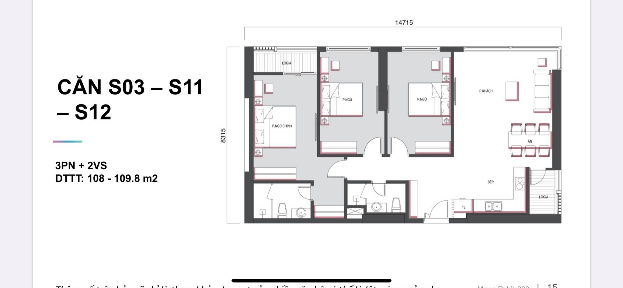 - Căn hộ 3 phòng ngủ: 93,6m2 – 107,8m2 – 110,2m2.