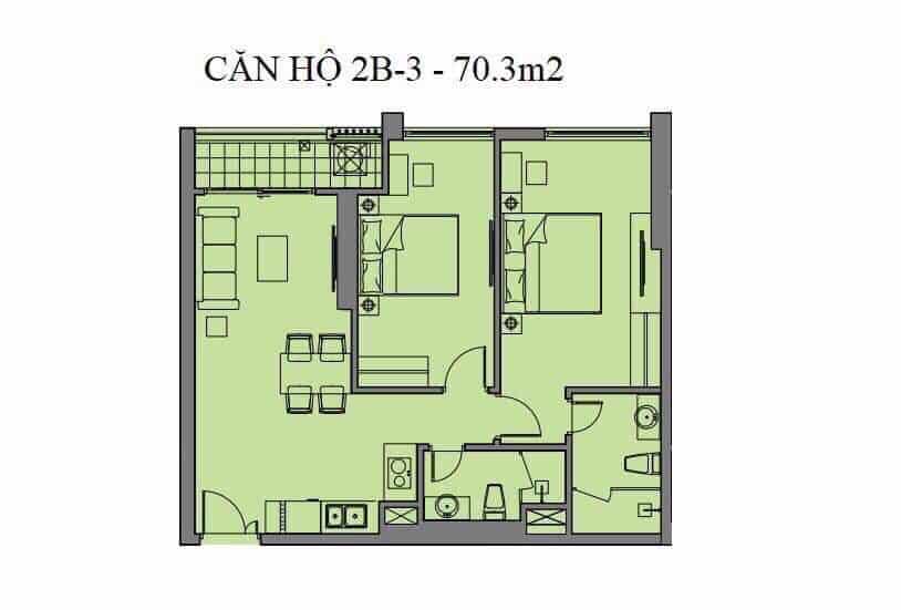 - Căn hộ 2 phòng ngủ + 1 vệ sinh: 53,3m2.
