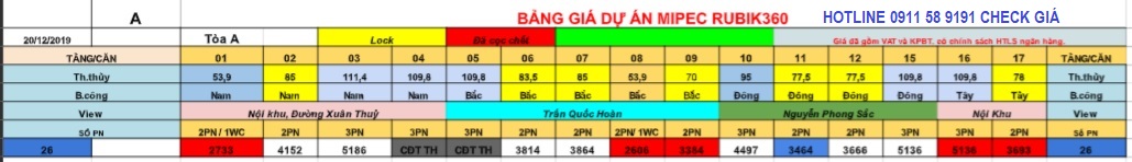 Mặt bằng Tháp A Dự án Mipec Rubik 360 Xuân Thủy cập nhật Tháng 12 năm 2019