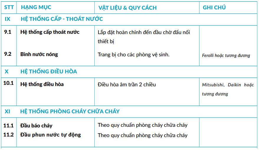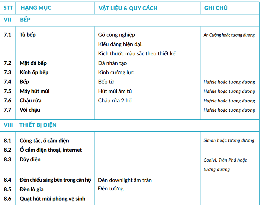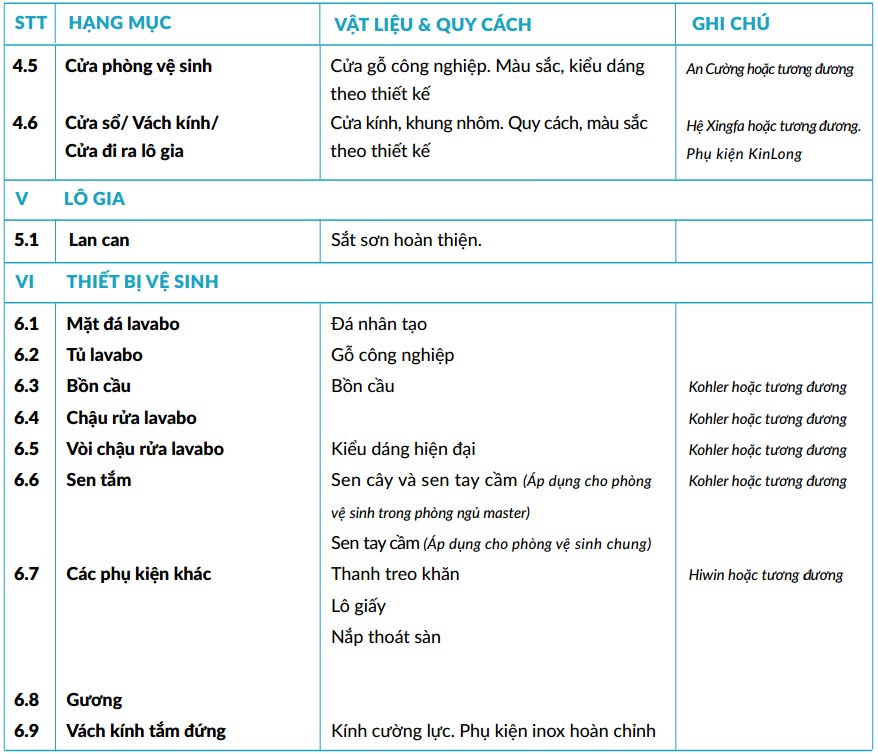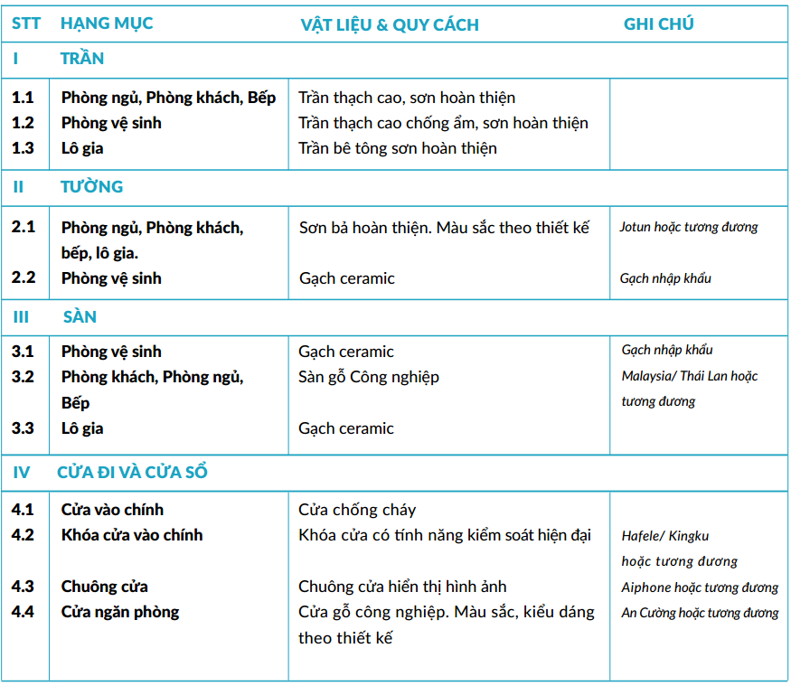 DANH MỤC VẬT LIỆU HOÀN THIỆN VÀ NỘI THẤT BÀN GIAO DỰ ÁN MIPEC RUBIK 360